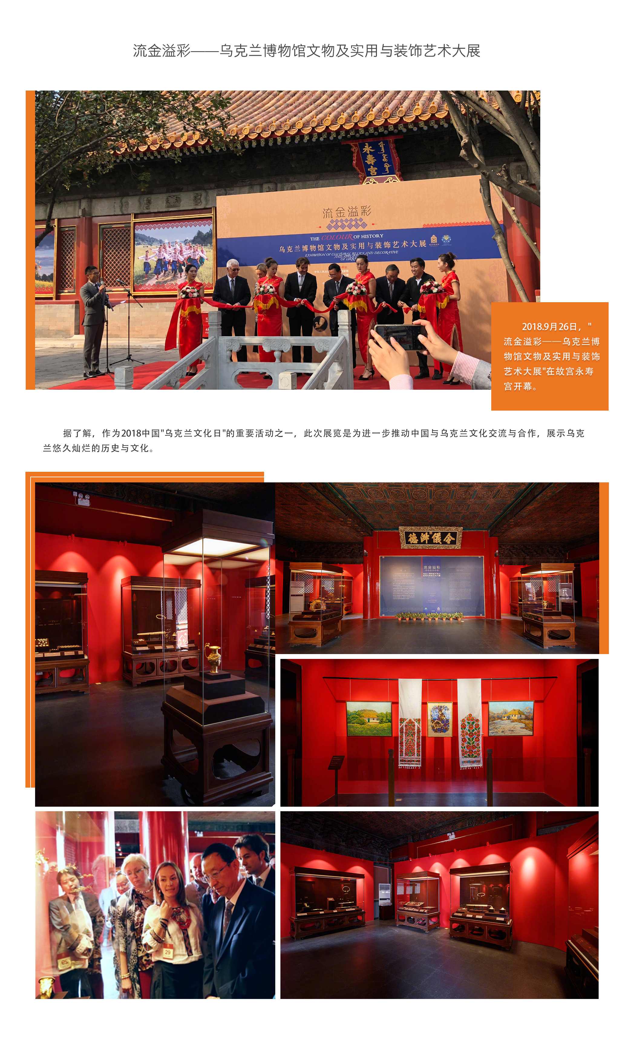 2018.9月26日,"流金溢彩——乌克兰博物馆文物及实用与装饰艺术大展"在故宫永寿宫开幕。据了解,作为2018中国"乌克兰文化日"的重要活动之一,此次展览是为进一步推动中国与乌克兰文化交流与合作,展示乌克兰悠久灿烂的历史与文化。