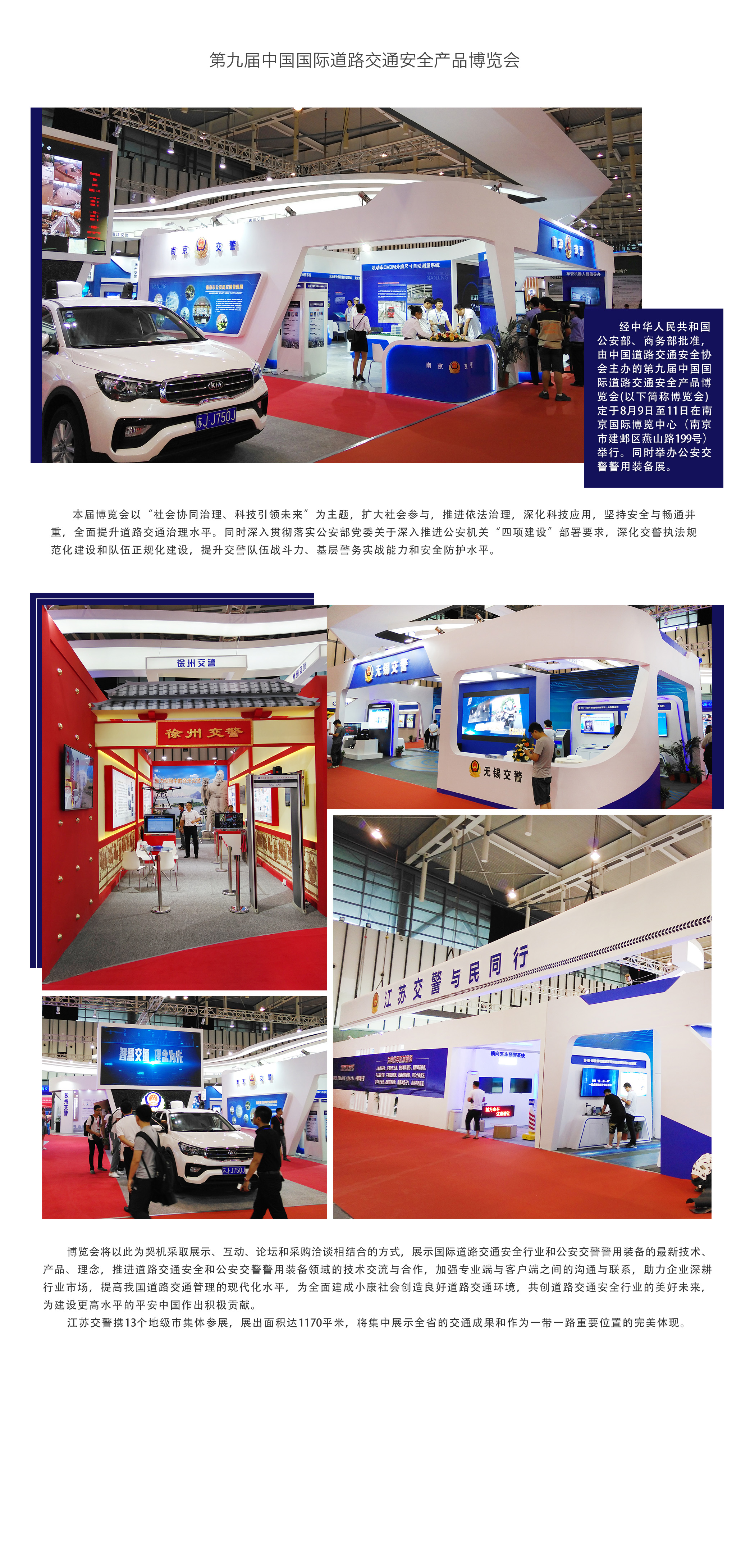 江苏交警携13个地级市集体参展,展出面积达1170平米,将集中展示全省的交通成果和作为一带一路重要位置的完美体现。