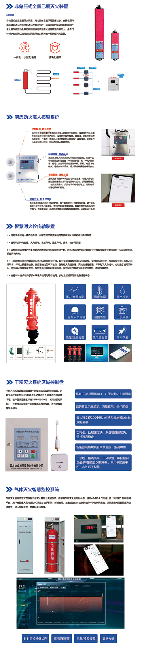 本次参与展出的消防终端设备包含:储能消防、非贮压式全氟己酮灭火装置、智慧消火栓传输装置、厨房动火离人报警系统、气体灭火智慧监控系统、干粉灭火系统区域控制盘等智能装置,链接物联网数据中台数据端口,实现远程监管、指令发送等功能,降低人工成本,提升消防防御处置效率。